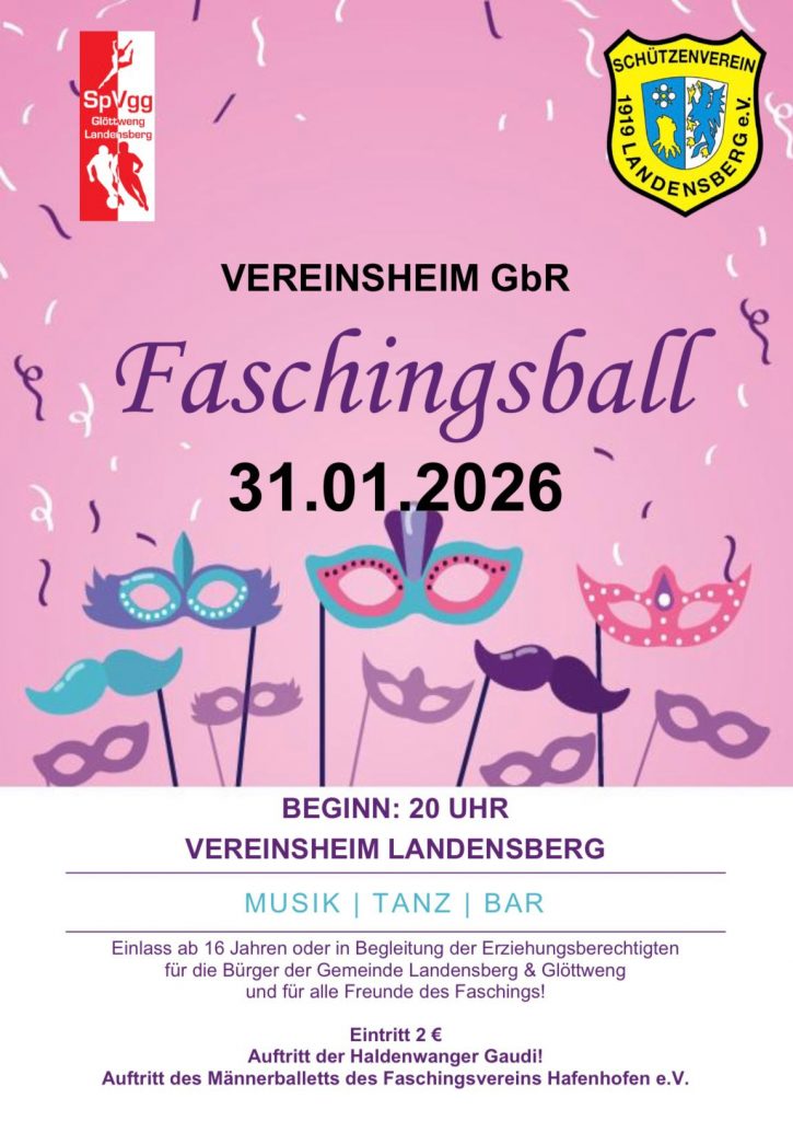 Am Samstag, den 31.01.2026 findet ab 20 Uhr für die Bürger der Gemeinde Landensberg & Glöttweng unser Faschingsball im Vereinsheim Landensberg statt. Einlass ab 16 Jahren oder in Begleitung eines Erziehungsberechtigten.